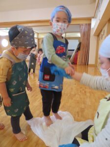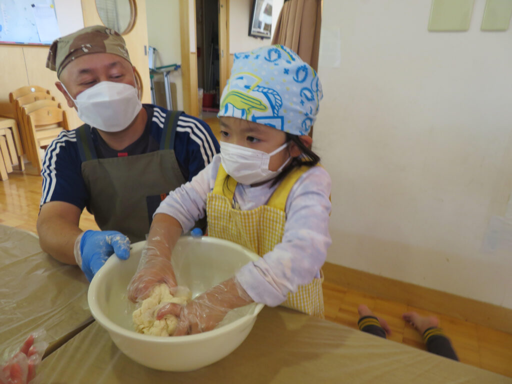 3歳児がうどん作りに挑戦しました。一人ひとりが粉をこねて