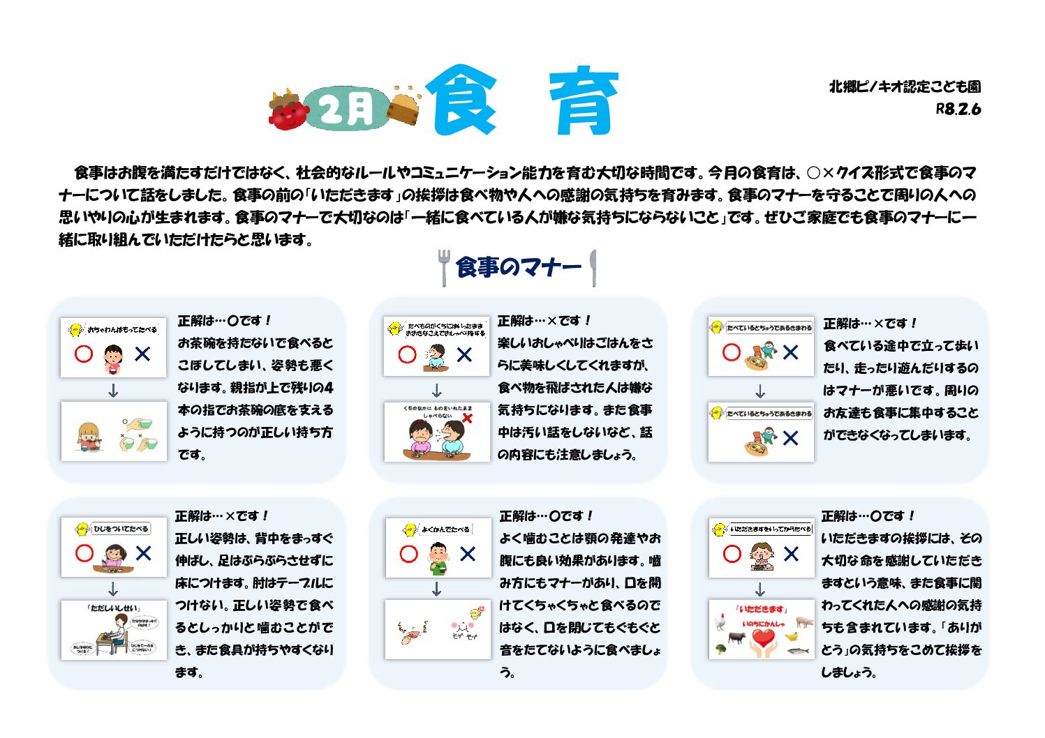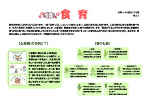 12月食育 12月から1月にかけて冬至やクリスマス、大晦日やお正月などいろいろな行事があります。今月の食育は、その様々な冬の行事と行事食について話をしました。何気なく食べていた行事食にも意味があり、家族の幸せや健康などの願いが込められています。また行事... 続きを見る 続きを見る